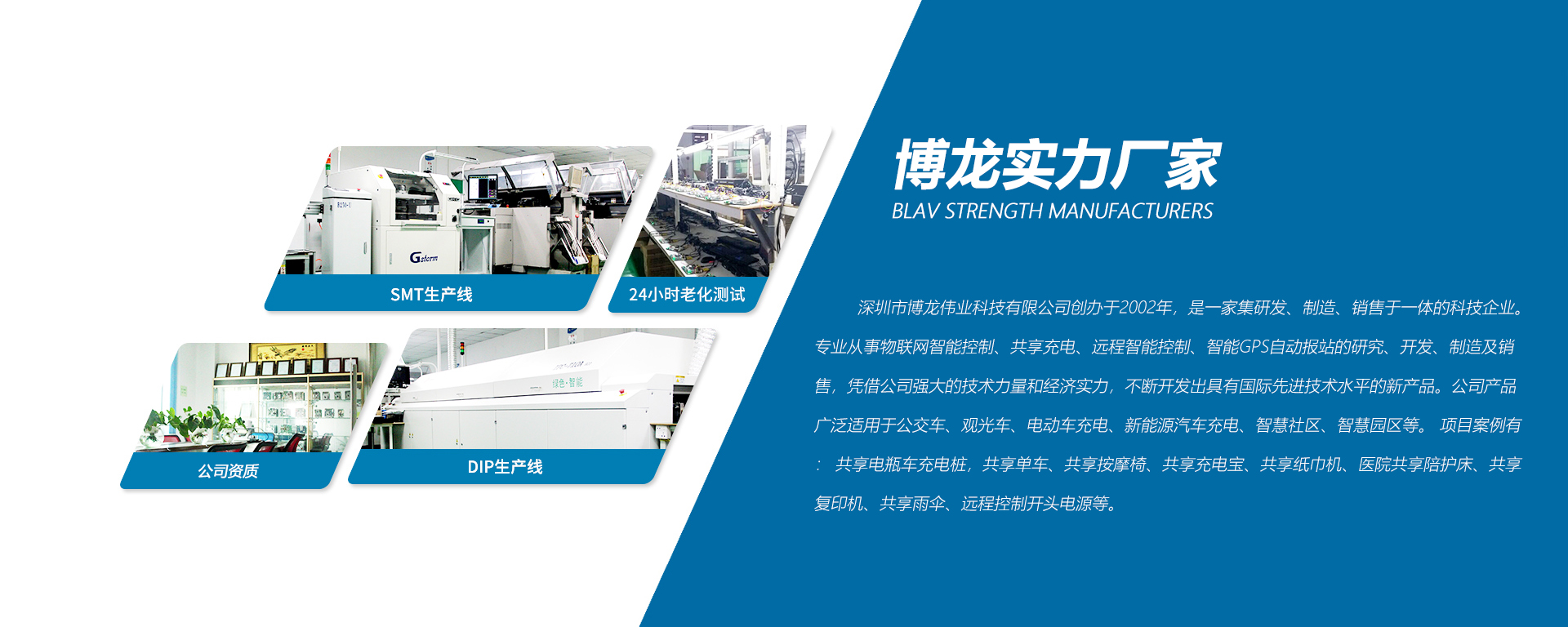深圳市博龍偉業(yè)科技有限公司創(chuàng)辦于2002年,是一家集研發(fā)、制造、銷(xiāo)售于一體的科技企業(yè)。專(zhuān)業(yè)從事物聯(lián)網(wǎng)智能控制、共享充電、遠(yuǎn)程智能控制、智能GPS自動(dòng)報(bào)站的研究、開(kāi)發(fā)、制造及銷(xiāo)售,憑借公司強(qiáng)大的技術(shù)力量和經(jīng)濟(jì)實(shí)力,不斷開(kāi)發(fā)出具有國(guó)際先進(jìn)技術(shù)水平的新產(chǎn)品。公司產(chǎn)品廣泛適用于公交車(chē)、觀光車(chē)、電動(dòng)車(chē)充電、新能源汽車(chē)充電、智慧社區(qū)、智慧園區(qū)等。 項(xiàng)目案例有: 共享電瓶車(chē)充電樁,共享單車(chē)、共享按摩椅、共享充電寶、共享紙巾機(jī)、醫(yī)院共享陪護(hù)床、共享復(fù)印 機(jī)、共享雨傘、遠(yuǎn)程控制開(kāi)頭電源等。